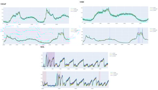 Our model captures the correlation between features through an F-transformer GRU and uses the T-transformer GRU that captures long-range temporal dependencies to achieve the most comprehensive information extraction. The results of TranAD and Anomaly-PTG show that the improved transformer’s feature extraction ability is helpful in time-series anomaly detection. Anomaly-PTG combines the associations and long-range temporal dependencies between the extracted features, inputs them into GRU to learn the sequential representation of time series data, and then comprehensively detects anomalies by combining reconstruction and prediction. The result is more stable than TranAD because it is easy to ignore an anomaly with minimal reconstruction error only by the reconstruction method, and the combination of the prediction method will make up for this defect and improve the detection accuracy. As shown in Figure 5, three dataset detection effects of the Anomaly-PTG model is listed. Green represents the actual data; yellow and blue represent the predicted data, and the reconstructed information, respectively. It can be seen that both prediction and reconstruction simulate the data distribution well and complement each other to a certain extent. By optimizing the combination of the two, anomalies can be better detected.