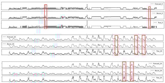 The figure shows data fluctuations between different features in the test set. The three lines are the predicted value, the reconstructed value, and the actual value, respectively. The prediction-based model can directly indicate the data of the following timestamp by using the time series data’s time dependence. The reconstruction-based model helps capture the global data distribution and can more accurately judge the abnormality according to the normal distribution of the data. Still, it is not easy to identify sudden data fluctuations because these fluctuant data may also conform to the normal data distribution, leading to missed abnormal detection. As marked by the red box in Figure 6, the prediction model can capture this mutation data, and the reconstruction-based approach does not capture this anomaly.