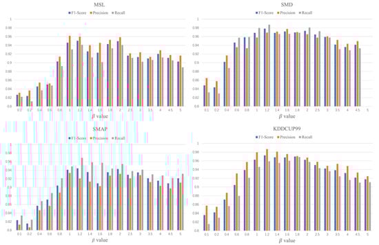 analysis: is the parameter that regulates the optimal combination of prediction and reconstruction methods. We combined the two methods to assign weights based on the sensitivity of abnormal data and found that different values will have a particular impact on the detection effect. Therefore, we conducted extensive experiments to evaluate the F1 value, recall, and precision of other on four datasets. The results are shown in Figure 7. When the value is 1.2, the F1 value shows the best results on the four datasets. When the value is less than 1, the detection accuracy of the model decreases significantly. When the value of is greater than 2, the model’s index gradually decreases and tends to be stable.