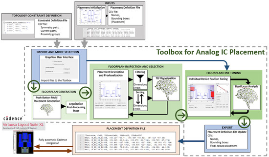 It can operate fully automatically, proposing floorplans at push-button speed given the bounding boxes of the circuit’s devices and the set of topological constraints that bind them. Due to the constraints’ complexity, it is common that no solution meets all constraints, and tradeoffs must be made. The toolbox uses a DL to produce a set of recommended placements automatically. The criteria used to evaluate the solutions are also shown, explaining the tool’s design choices. This feedback mechanism identifies, for each device, its location contribution to the overall cost, providing intuition to the designer on the many constraints that the placement is subject to. The designer can then analyze and select one of the placement solutions out of the many produced by the toolbox. Moreover, the feedback mechanism can also guide manual adjustments to the generated floorplans or imported previous designs, keeping the designer informed of the changes’ impact.