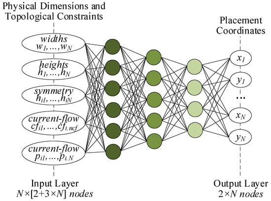 ANN architecture that is used to solve the map from the physical dimensions and topological constraints to the placement coordinates.