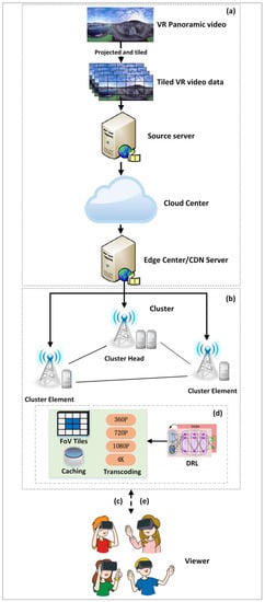 (d) VR panoramic video service decision: According to the user’s viewport selection, the network quality and the load situation of MEC edge nodes in a clustered edge, the proposed FDRL-CBA algorithm is used to obtain edge caching and bitrate adaptation decisions.
