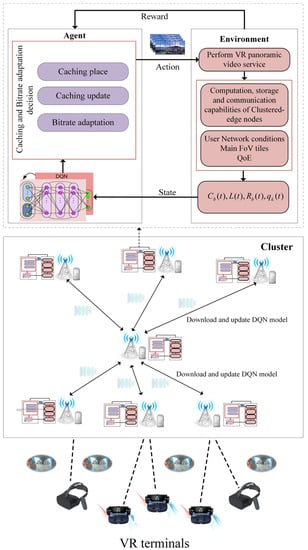 In recent years, many scholars have carried out a lot of work on virtual reality video transmission research [8,9,10,11], including introducing reinforcement learning (RL) algorithms [12] to solve problems such as video proactive cache and rate adaptation. Based on the ability of deep reinforcement learning (DRL) to solve complex problems with changing environments [13,14], it has also been widely used in video transmission optimization. However, the DRL-based algorithm has the defects of instability and being susceptible to falling into the local optimal solution. In order to effectively improve learning efficiency, federated learning (FL) has been proposed to establish a federated learning model based on distributed datasets, which not only solves data transmission consumption, but also shares different training data [15]. Furthermore, how to better meet the computing, caching and communication resources required in VR panoramic video transmission and intelligent decision making is still an urgent problem.