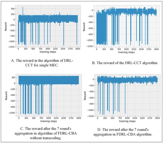 Figure 4 shows a comparison of the convergence of the four methods. It can be seen from the figure that the loss value of all methods has volatility, which is determined by the characteristics of deep reinforcement learning. However, with the progress of federated learning, the loss value range of the FDRL-based methods gradually becomes smaller, especially the FDRL-CBA method. Moreover, compared with the DRL-based methods, the loss value of federated deep reinforcement learning converges faster after aggregation, and the training efficiency is higher, which confirms that federated learning can improve the training effect of deep reinforcement learning.