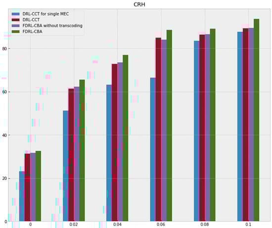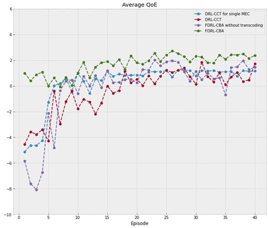 The QoE performance in different algorithms is given in Figure 7. In terms of QoE performance of users, the algorithm based on FDRL-CBA achieved stability and showed the best performance. Compared with the DRL-based algorithm, the FDRL-CBA algorithm improved the video experience quality. This is because federated learning makes full use of distributed training data, which improves the accuracy of the DRL model to a certain extent. The QoE performance of the FDRL-CBA method outperforms the method of FDRL-CBA without transcoding, which shows the necessity of joint optimization of caching and transcoding. Therefore, the simulation results are consistent with the theoretical results. In conclusion, the method proposed in this paper achieves better performance in terms of cache hit rate and QoE.