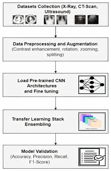 In this section, the devised methodology is introduced; it was trained and tested on three datasets and the subsequent results are reported and discussed in the results section. The proposed method outperformed other similar available methods, in terms of model accuracy, in the number of images used in experiments and using more than one image data modality. The overall workflow for pandemic detection from Medical Imaging is depicted in Figure 1 and described in this section.