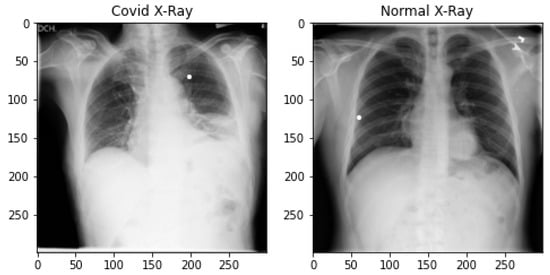The chest X-ray dataset is prepared from three different sources [52,53,54]. It is the largest publicly available open-source chest X-ray dataset prepared by a team of researchers from various universities in cooperation with medical doctors and is constantly updating. At the time of this study, it contains 3616 pandemic-positive cases of X-ray images, 1345 viral pneumonia and 10,192 normal chest X-ray images. A total of 4600 images are taken from normal chest X-ray images to make the data balanced. All images are in Portable Network Graphic (png) format, having a resolution of 299 × 299 pixels. The total number of pandemic-infected X-ray images used in this research is 4583. We did not use pneumonia images. The samples of both normal and pandemic-infected chest X-rays are shown in Figure 2.