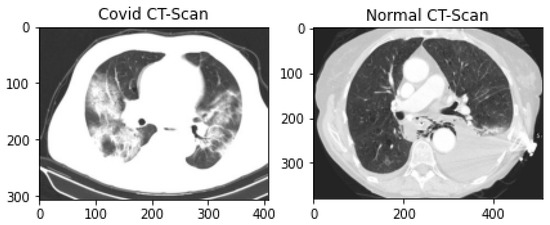The public CT scan dataset for pandemic diagnosis and classification used in this research is SARS-CoV-2 CT-scan, prepared by Soares et al. These data were collected from hospitals in Sao Paulo, Brazil, and are publicly available on Kaggle Repository [55]. This dataset contains 2482 CT scans (1252 infected lung CT-scan images and 1230 non-infected lung scan images). The dataset consists of CT scans of 62 male patients and 58 female patients. This dataset comprises 2D slices of CT scans with no standard-size images. The smallest image in the dataset is 104 × 153 while the largest one is 484 × 416. The samples of both normal and pandemic-infected CT scans are shown in Figure 3.