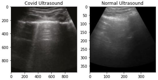 The Public LUS dataset (POCUS) is used in this research; it is compiled by Born et al. [56]. POCUS dataset contains videos and images of two types, convex and linear. Convex and linear are two types of transducers, which are used to generate ultrasound. At the time of this study, it contained in total 162 videos of convex probe (46 pandemic-infected, 46 bacterial pneumonia, 64 healthy and three viral pneumonia). It had twenty videos of linear probe (6 pandemic-infected, 2 bacterial, 9 healthy, 3 viral pneumonia). The butterfly dataset was not considered in this study. The total number of images of the convex probe is 53, including 18 pandemic-infected, 20 pneumonia and 15 healthy LUS images. There are 6 images of the linear probe, with 4 pandemic-infected and 2 pneumonia images. The samples of both normal and pandemic-infected lung ultrasounds are shown in Figure 4.