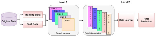 The process of combining the contribution of homogeneous or heterogeneous ML/DL models to improve the overall performance results is known as ensembling [58]. It is also common practice in the medical field that opinions from multiple expert doctors about diagnosis are taken for greater reliability; ensemble learning involves the same concept. It allows the combination of the contribution of each base learner to give more accurate results and low variance in prediction errors. Different ensemble methods are used in different studies, including boosting, bagging and stacking [59]. In boosting, the misclassified samples from the first base learner are passed to another learner for training, which increases the problem of overfitting [60]. In bagging ensembling, the training dataset is divided into N numbers according to base learners and each model is trained on a sub-part of data. Hence it also increases the overfitting problem when there is a smaller number of training samples. The idea of stack ensembling is to train several heterogeneous models and combine them by using a meta classifier or meta learner using the predictions returned by base learners to give results. The basic idea of stack ensembling is illustrated in Figure 5.