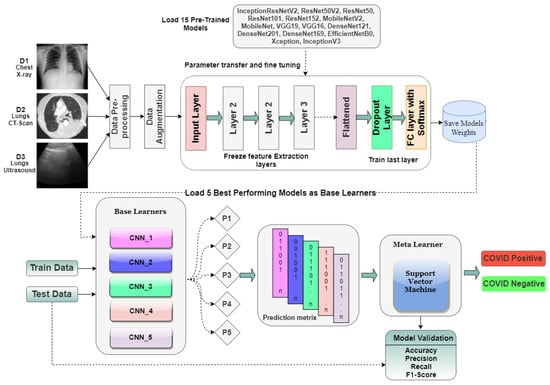 Two-level deep stack ensembling is proposed in this research for accurate diagnosis of the pandemic. The proposed model is illustrated in Figure 6. In the first level, five CNN architectures out of fifteen, having the best performances, are picked as base learners. Base learners for each dataset (CT-scan, Xray, LUS) have to be different according to the performances on an individual dataset. Each CNN will give the predictions 0 or 1 (0 for pandemic negative, 1 for pandemic positive) on test data, which offers five arrays. These arrays are combined to form a prediction matrix using the dstack() function of the Numpy library. This prediction matrix acts as a training set for a meta-classifier. Finally, the meta classifier predicts the test dataset, which is the final result of ensembling. The overall workflow and calculations are depicted from Algorithm 1.