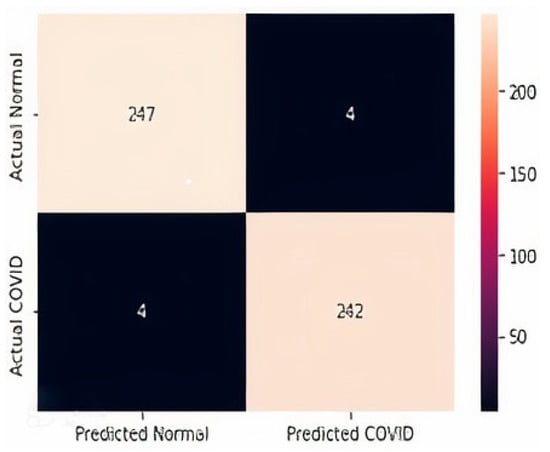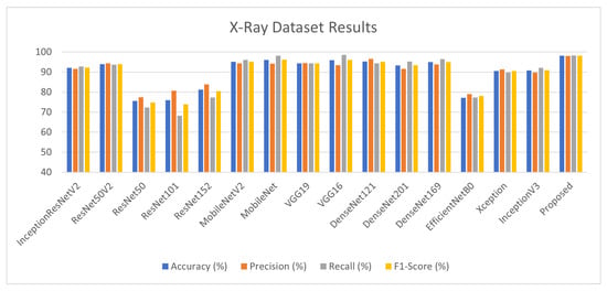 Among these models, ResNet50 achieves high-performance accuracy, i.e., 98%. In reference [15], DL-based CNN models are applied to the dataset of 6432 X-ray scans. Three models—InceptionV3, Xception and ResNeXt—are evaluated and compared, resulting in high accuracy for the Xception model, i.e., 97%. However, they used an unbalanced dataset of positive and negative samples of pandemic samples. In [16], the authors proposed a system for early prediction of pandemics using X-ray radiographs by applying different AI techniques. CNN is implied in two ways. First, it is used for classification by using the softmax layer. In the second scenario, it is applied for feature extraction. These features are then passed to other classifiers, i.e., SVM and RF.