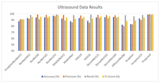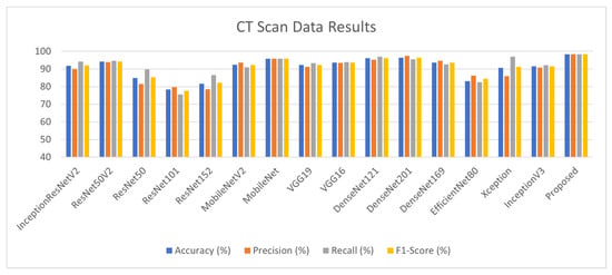 The Keras DL models are employed to perform stacking and various matrices are calculated for each model as well as proposed architecture as illustrated in Table 5 and Figure 7. Training and validation batch size is kept at 90 with 7256 training and 1812 validation samples with an image size of 224. The Keras DL neural network library is used to fit the models using image data augmentation via the ImageDataGenerator class. The results highlighted in red are the models with the best performances out of the 15 models. The weights of these models are utilized in the deep stack ensembling approach to achieve 98.2% accuracy, outperforming the approaches in the literature.