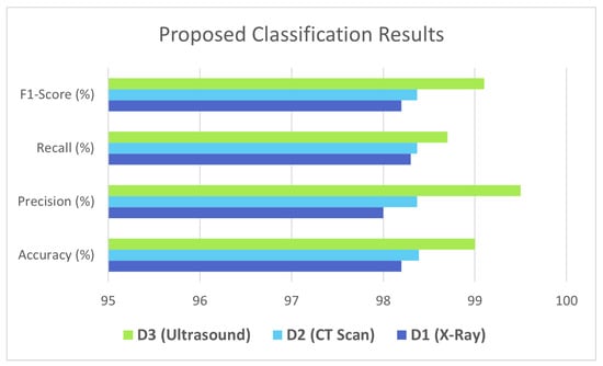 From the evaluation, it is shown that the proposed approach achieved good results for all three datasets, i.e., 99% test accuracy is achieved on the Ultrasound dataset, whereas 98.3% and 98.2% are achieved on X-ray and CT scan datasets. It is clear from these results that the proposed architecture performs best for both small and large datasets, as there are 2482 X-ray samples and 1811 ultrasound samples. This study also shows the importance of using DL technologies and Medical Imaging modalities in the prediction of pandemics, which can help in reducing the huge burden on the limited healthcare systems in most nations around the world.