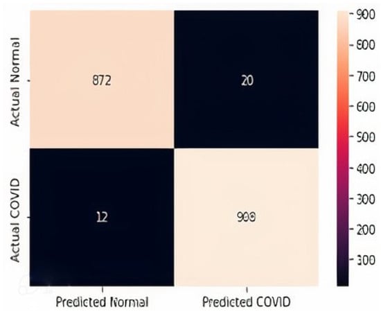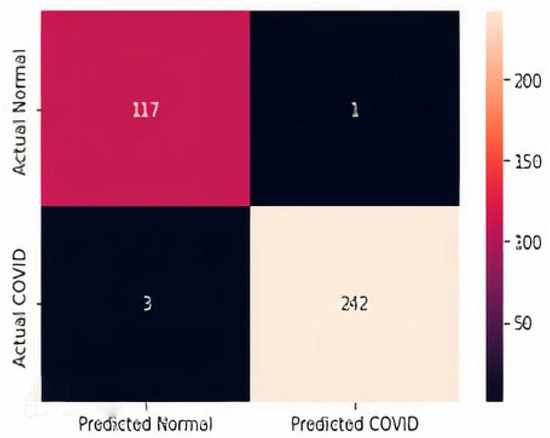 The confusion matrices for all three datasets are displayed in Figure 14, Figure 15 and Figure 16. It is shown that for the chest X-ray dataset, the proposed model correctly predicts 908 samples as positive while it correctly predicts 872 samples as normal out of 1812 total test samples. For the CT scan dataset, the model correctly predicts 242 positive samples and 247 negative samples from the total test samples, i.e., 497. Similarly, the proposed model correctly predicts 242 positive ultrasound samples and 117 negative samples from the total 363 ultrasound test samples.
