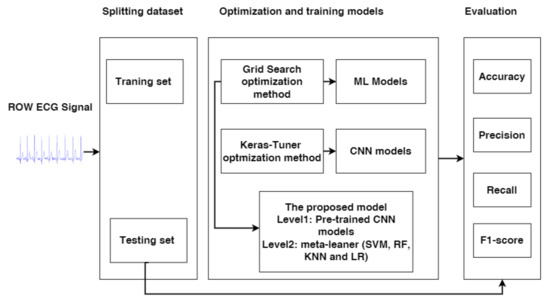 In this work, we propose the stacking ensemble integrated pre-trained models CNN-Model1, CNN-Model2, and CNN-Model3 with four meta-learner classifiers SVM, RF, LR, and KNN. In addition, we propose models compared with the ML and CNN models. We will use optimization techniques to optimize the models, such as grid search for ML and meta-learner classifiers and Keras Tuner for CNN models. In addition, we will describe the complete processes that are applied for the prediction MI, as shown in Figure 1.