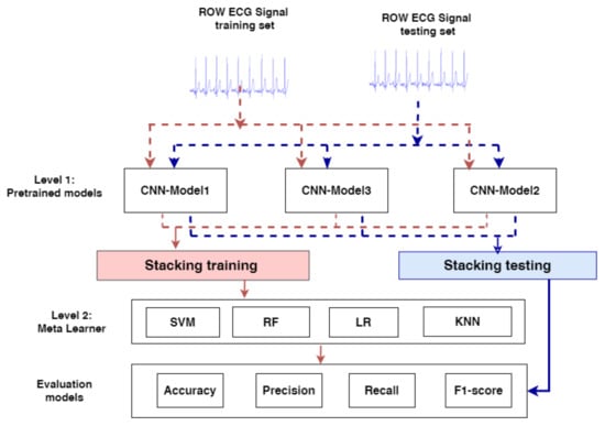 Maintaining public health has become a critical challenge and objective for health organizations around the world. Therefore, many studies have used ML, DL, and deep CNN [22,23,24] to identify patients at risk of MI and to find ways to help diagnose or cure MI diseases. Previous studies have used ML, CNN, and hybrid models to detect MI. In addition, they do not use stacking and ensemble based on different heterogeneous architectures of the CNN models. As a result, this the first time that stacking ensemble has been used for this disease. We proposed a stacking ensemble model that combined the three CNN base models of CNN-Model1, CNN-Model2, and CNN-Model3 with the meta-learner classifiers from SVM, RF, KNN, or LR to investigate the risk identification practices in critical healthcare use cases of MI.