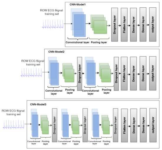 The training of CNNs enables the automated extraction of high-level features. In this study, three CNN models: CNN-Model1, CNN-Model2, and CNN-Model3, are proposed for the classification of heartbeats. The structure of the three CNN models is illustrated in Figure 3.