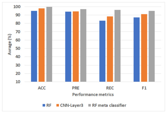 Figure 4 represents the best ML, CNN, and proposed models for the MIT-BIH dataset. We can see that the proposed model-based RF meta classifier achieves the best performance compared to RF and CNN-Model2. The RF meta classifier improves ACC by 4.8, PRC by 3, REC by 7.6, and F1 by 4 compared to RF. The RF meta classifier improves ACC by 1.8, PRC by 2.8, REC by 5.5, and F1 by 4.5, compared to the CNN-Layer3.