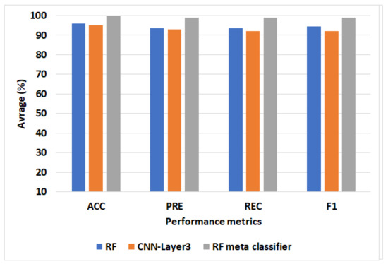 For the PTB dataset, ACC, PRC, REC, and F1 of CNN were recorded as 98.84%, 98.31%, 97.92%, and 97.63%, respectively, in Ref. [26]. In Ref. [35], 3-layers of LSTM were recorded with PRC of 91% and F1 90%. In Ref. [36], ACC of an ANN model was obtained at 91.1%. In RefS. [27,28], the ACC of a CNN model was recorded at 99% and 95.2%, respectively. In Ref. [37], LS-SVM was recorded at 99.31%. In Ref. [34], F1 of CNN-LSTM was recorded at 94.6%. The proposed model-based RF meta-classifier achieved the highest average of ACC, PRC, REC, and F1 at 99.7%, 99%, 99%, and 99%, respectively.