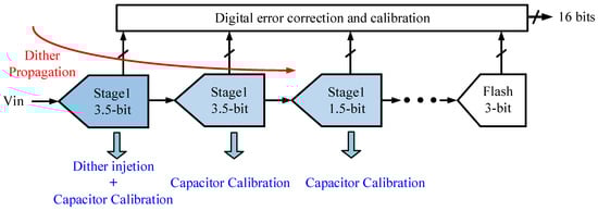 In wireless communication points, such as a base station or radar system, a large spurious-free dynamic range (SFDR) is essential to avoid interference from adjacent channels. In addition, tens of MHz of bandwidth are needed to cover the wideband input signal, thereby demanding a sample rate of >100 MHz [1,2,3,4,5,6]. A pipelined structure is usually employed in these scenarios [7,8,9,10,11,12]. All the pipeline stages operate concurrently, thereby enhancing the overall speed. Moreover, the inter-stage gain improves the accuracy because non-idealities in the back-end stages are attenuated by the gain in the preceding stages. However, two main factors limit the dynamic performance in pipelined analog-to-digital converters (ADCs). A capacitor mismatch in the multiplying digital-to-analog converter (MDAC) causes a bit-weight error. At the point of each comparator threshold, this bit-weight error leads to missing code or non-monotonicity [13]. In addition, the residue gain in the analog domain is requested to match the gain in the digital domain. Otherwise, quantization error leakage happens in the pipeline stage, severely deteriorating the dynamic performance [14]. Analog techniques can remedy the above issues but have a high cost [15,16,17,18]. Recently, the digital method has become preferable to resolve the bit-weight deviation problem, especially as complementary metal–oxide–semiconductor (CMOS) technology is now developing rapidly [19,20,21,22,23,24,25]. In [19,20,21], calibration speed was enhanced using a complicated digital algorithm with a large hardware cost. In [22,23], higher harmonics were calibrated, but the convergence speed was quite low since many parameters need to be calculated. In [24], the ADC was split and the analog circuit complexity significantly increased.