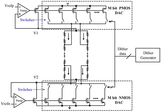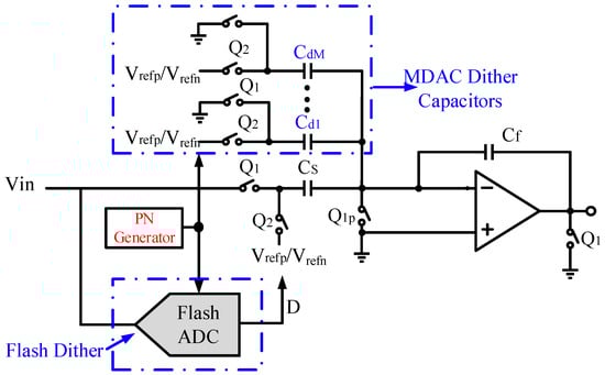 In [1,13], the authors proposed to solve the calibration of capacitor mismatch by switching the MDAC capacitors one by one. Then, all the error codes can be calculated and stored. The ADC output is reconstructed by adding or subtracting these error codes. However, the calibration accuracy is limited by the back-end ADC accuracy and the digital truncation error. Additionally, an input signal with a small amplitude is prone to a differential non-linearity (DNL) error caused by capacitor mismatch. Therefore, if the calibration accuracy is limited, the small signal conversion is degraded. To improve the linearity of the ADC, the dither technique is usually employed [26,27,28]. It provides several virtual comparison thresholds, which enhance the linearity, especially when the input signal amplitude is small. However, the injected dither decreases the signal range, thereby degrading the dynamic performance. Additionally, dither injection causes an increment in the residue signal, which degenerates the amplifier linearity. Moreover, the detailed circuit of the dither injection was not given.