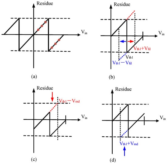 The red arrow means a positive dither injection, and the blue one means a negative dither injection, both in the sub-ADC. Note that the dither injection causes the residue to exceed the original swing. The voltage swing due to the flash dither now ranges from −Vref/2 − Vfd to Vref/2 + Vfd, where Vfd is the flash dither amplitude. This voltage swing increment occupies the redundancy range that is otherwise allocated for other non-ideal factors, such as noise and offset. In addition, the inter-stage amplifier induces non-linearity owing to this larger voltage swing. To remedy this issue, we propose a counteracting dither technique. In Figure 3c,d, we inject a dither signal in the MDAC, and the direction is opposite to the flash dither. As shown in Figure 3c, the flash dither is positive (+Vfd) while a negative one (−Vmd) is injected, and thus the residue swing restores to the original range. The other case is shown in Figure 3d. Consequently, if Vfd equals Vmd, the maximum amplifier output remains the same if no dither signal is injected. The flash dither can linearize the injected pipeline stage, while the MDAC dither can be propagated to the back-end stages. The above dither injection scheme for Vth1 is simultaneously executed in all the 16 comparators in the flash ADC. The residue signal is randomized, so spurs from some uncalibrated factors are broken into the noise floor. The flash dither does not influence the final conversion result because it is corrected by the redundancy. Nevertheless, the MDAC dither must be precisely subtracted in the digital domain to avoid any dither leakage.