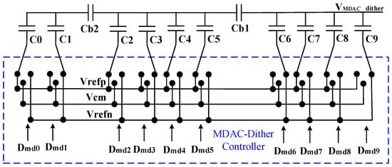 The number of the dither level determines the effect of the linearity improvement. We employ a 10-bit level MDAC dither. These dither levels are uniformly distributed in each sub-range. To realize the abovementioned counteracting dither technique, we modify the original MDAC and sub-ADC. The MDAC dither is realized by a capacitor array controlled by a dither generator and logic circuit, as shown in Figure 4. The least significant bit (LSB) of the MDAC dither is Vsub/2M, where Vsub is the sub-range voltage, and M is the MDAC dither bit used. Note that the LSB of the MDAC dither amplitude is quite small. As a result, the dither DAC consists of a capacitor array with bridge capacitors, which can attenuate the weight of the capacitors and realize the small dither amplitude. In Figure 4, Cb2 attenuates the weights of C0 and C1, while Cb1 can attenuate the weights of C0 to C5 furthermore. The dither DAC is switched by a controller, as shown in Figure 5. The multi-level dither signal is generated by linear feedback shift registers (LFSR) designed in the digital domain [30].