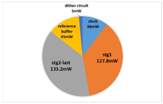 The linearity improvement effect relies on the number of the dither level [28,29]. We employ the theory in the 16-bit pipelined ADC, in which each stage consists of a flash sub-ADC and an MDAC. As shown in Figure 1, the first two stages resolve more bits than the latter stages owing to a trade-off between the power efficiency and circuit complexity [27]. Capacitor mismatches in the first three stages are calibrated, whereas the capacitor matching accuracy is enough in the back-end stages. The residue gain accuracy is guaranteed by the gain-boosting technique, thus avoiding a complicated background calibration algorithm [17]. For instance, the amplifier output in the first pipelined stage needs a 12-bit accuracy for the back-end stage. Therefore, the loop gain and bandwidth should achieve over 72 dB and 310 MHz, respectively. The proposed dither technique is adopted in the first pipeline stage, and the dithering effect is propagated to all the later pipeline stages.