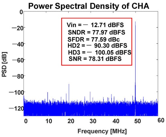 To demonstrate the effectiveness of the dither scheme, we obtained the dynamic performance of the ADC with a small input signal (−12.7 dBFS). As shown in Figure 10, without calibration or dither injection, the SFDR was about 78 dBc. This result is mainly due to a capacitor mismatch. With capacitor mismatch calibration, the SFDR improved to 81 dBc, as depicted in Figure 11. However, the small signal is prone to the residual uncalibrated error, and thus it only achieved a 3 dB improvement. In Figure 12, it can be seen that the SFDR could be significantly enhanced to 85 dB thanks to the proposed flash dither and MDAC dither.