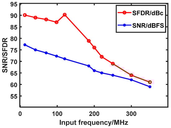 With a large input signal (about −1 dBFS), the dynamic performance relied mainly on the analog front end. As depicted in Figure 13, after calibration, the SFDR of the ADC with a low frequency input could obtain about 90 dBc. Even with Nyquist input, the SFDR remained at over 85 dBc.