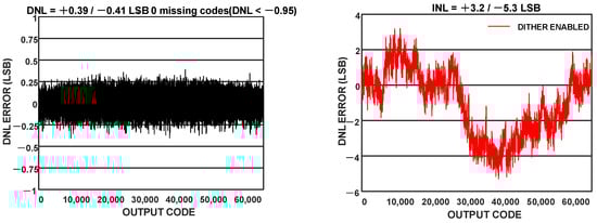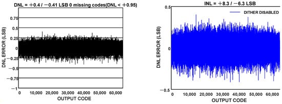 The capacitor mismatch also degraded the differential non-linearity (DNL) and integral non-linearity (INL). With the proposed calibration and dither injection scheme, DNL improved from 0.4 LSB/−0.41 LSB to 0.39 LSB/−0.41 LSB, and INL improved from 8.3 LSBs/−6.3 LSBs to 3.2 LSBs/−4.5 LSBs, as depicted in Figure 14 and Figure 15. According to the measurement results, the Walden figure of merit (FoM) was 416 fj/conv-step.