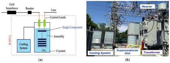 SFCLs consist of various types, including the resistive type, inductive type, and saturated-core type, etc., among which the resistive-type SFCL is the most developable and commercial type due to its simple structure, low weight and small size, and lower required amount of superconductive material, which leads to reduced operation cost [3,27,28]. Indeed, the RSFCL is a nonlinear resistor with no resistance in normal conditions but a high resistance in fault events, which limits the fault current by increasing the current density in the superconductor for a limited time. Its operation is based on the physical properties of its superconductor element and thus, no external controls are required [3]. Figure 1a shows the schematic of a RSFCL in series with a line, and a practical installation of SFCL is presented in Figure 1b. The superconducting element is immersed into a coolant bath as the main current-carrying conductor, which passes the normal load current with theoretically zero losses [29].