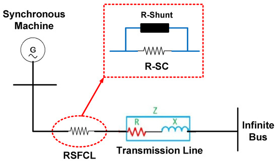 Figure 2 illustrates a simple model of RSFCL in a single-machine infinite bus (SMIB) system. A typical RSFCL is usually consisted of n interconnected units in which every unit involves a shunt resistance, RShunt, in parallel with a superconductor resistance of RSC [11,28]. RShunt and RSC are zero in normal steady-state condition. Once the quenching is occurred, they will have non-zero time-varying values [20]. Total resistance of the RSFCL during a fault depends on the series-connected number of units.