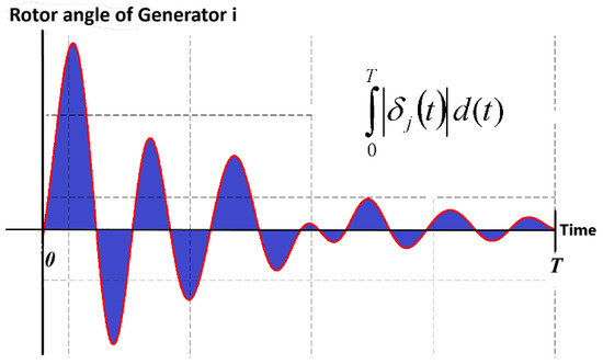 The existence of will cause a change in the related element of the matrix, resulting in a variation in the voltage angle differences between the generators, as well as the electrical power () of the system. A more detailed model of power systems and their transient stability studies in the presence of RSFCLs was presented in [11,19]. Once a fault occurs, the rotor angle of generators will start to oscillate depending on the fault location and its clearing time. In an n-generator power system, one generator is slack, and the remaining (n − 1) generators are considered non-slack generators. To investigate the transient stability of a system in the case of a short-circuit event, the rotor angle (δ) oscillations of non-slack generators are depicted vs. that of the slack generator, wherein the damping of these oscillations in a suitable time interval will reveal the stability of the system [22,38]. Therefore, the area under the rotor angle curve in a specified time interval can be considered a criterion for transient stability assessment. Figure 4 illustrates the δ oscillation of a generator at a time interval of T. The integration of this curve in a [0 − T] interval will result in its area. Hence, the reduced area of the δ oscillation curve denotes that either the amplitude of oscillations are decreased or the oscillations are damped faster, both revealing the transient stability improvement.