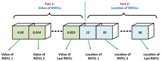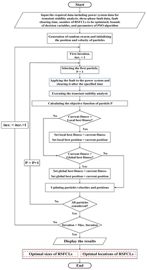A typical particle in PSO for the proposed optimization problem is presented in Figure 5. This particle includes two parts. Each dimension in part 1 represents the size of the corresponding RSFCL as a real number within the considered bounds. In part 2, the location of the candidate RSFCL is presented by a discrete value. The flowchart of the proposed PSO-based algorithm is shown in Figure 6. The algorithm is coded in MATLAB using power system toolbox [22] for performing the transient stability analysis.