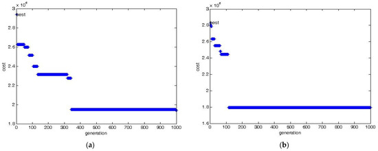 Convergence curve of PSO for the proposed objective function. (a) Scenario 1 (3 RSFCLs), (b) Scenario 2 (5 RSFCLs).