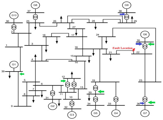 The IEEE 39-bus New England system is employed to investigate the efficiency of the proposed method with more detailed evaluations. This system, which is the well-known standard system for performing the stability studies, is a simplified model of the high-voltage transmission system in the northeast of the U.S.A. (New England area) and consists of 39 buses, 10 generators, 19 loads, 34 lines, and 12 transformers. Figure 7 illustrates a single-line diagram of this system, and its detailed data is available in [44]. The simulation file of this system using DIgSILENT Power Factory is accessible in [23], which is modeled at the nominal frequency of 60 Hz and the main voltage level of 345 kV [44]. Generator “G1” represents the interconnection to the rest of the transmission system (U.S. and Canadian) and is therefore directly connected at the 345 kV level. All other generators are connected via transformers. In addition, generator “G2” is the slack element of the network model [44].