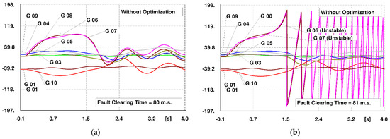 CCT of the system before optimization (for the considered short-circuit fault). (a) FCT = 80 m.s. (stable), (b) FCT = 81 m.s. (unstable).