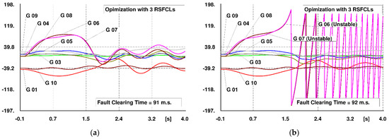 Critical fault clearing time (CCT) defines the maximum time a severe fault can be applied to a power system while keeping its stability [45,46]. Indeed, the system will remain stable when a fault is cleared before the CCT [47,48]. The CCT mainly accounts for the system parameters, as well as the implemented protection features in the power system, including protective relay type, breaker interrupt time, fault detector reset time, margin time, and backup breaker interrupt time [49]. In a fast protection system, considering the properties of the protection system, it will take typically three to five cycles before a fault can be cleared, which for a system with an operating frequency of 60 Hz, will need a minimum of 50 to 85 m.s. so that the system can clear the fault and remain stable [49]. In a power system and in order to make a safer margin for the transient stability, the greater the CCT, the more stable the system against severe disturbances, meaning that the protection system has a reliable margin time to clear the fault without losing system stability. Hence, CCT is usually considered a crucial index of transient stability assessment in a power system. Table 4 summarizes the CCT of the investigated scenarios compared to that in the case of not employing RSFCLs, as the base-case scenario. In addition, the simulations of CCT calculation in the 39-bus New England system in the base case, as well as the scenarios of applying three and five RSFCLs, are illustrated in Figure 10, Figure 11, and Figure 12, respectively. It is observed that, in the base case and for the considered fault, the CCT of the system is 80 m.s., which is very close to the above-mentioned bound (at FCT = 81 m.s., generators G6 and G7 become unstable). Hence, there is almost no security margin for the transient stability in the system. However, through the implementation of the optimal RSFCLs resulting from the proposed optimization algorithm, the CCT of the system has been increased to 91 and 226 m.s. in cases of employing three and five RSFCLs, respectively, demonstrating the good sufficiency and effectiveness of both scenarios in improving the CCT of the power system and thus, the enhancement of the transient stability margin based on the considered three-phase short-circuit fault. Moreover, it is realized that, in Scenario 1, the CCT has been improved by 11 m.s., while in Scenario 2, the CCT enhancement is 146 m.s. Hence, there is a significant increase in the CCT of Scenario 2 compared to that of Scenario 1, presenting a helpful guideline for power system planners to select the appropriate stability scheme, taking into account the technical and economic tradeoffs between the two scenarios.