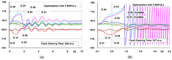 CCT in Scenario 2 (5 RSFCLs) for the considered short-circuit fault. (a) FCT = 226 m.s. (stable), (b) FCT = 227 m.s. (unstable).
