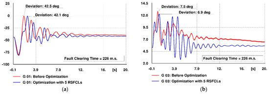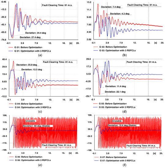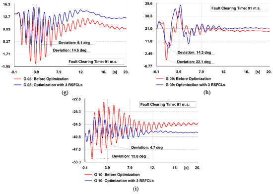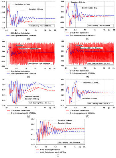 Figure 13a–i illustrates the generators’ rotor angle deviations with reference to that of the reference machine. Red-colored curves depict the rotor angle oscillations before optimization, while the blue-colored curves represent the rotor angle oscillations in the presence of optimized RSFCLs. The curves depict a reduction in the maximum deviation of the rotor angles in the case of employing optimization results. Moreover, optimized RSFCLs have made the generators G6 and G7 stable.