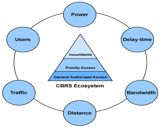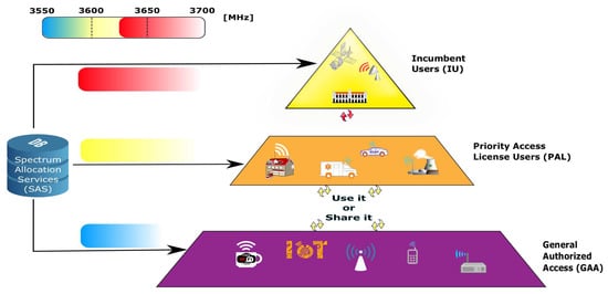 The ubiquity of smartphones and smart objects has augmented the volume of data flow across the globe. It has propelled the requirement for additional spectra to meet the ever-increasing demands of high data rates. Researchers in industries and academia are striving to explore wireless communications in novel bands such as mmWave, THz spectrum, and visible light spectrum [1,2,3]. An alternate strategy to mitigate the spectrum dearth lies in the efficient use of the existing spectrum, which requires technological and policy innovation. Technologically, cognitive radio networks can be a promising solution to leverage the existing spectrum for boosting the capacity of wireless networks as their prioritized and dynamic spectrum access capabilities can efficiently transform the spectrum holes into transmission opportunities [4]. At the policy level, the Federal Communications Commission (FCC) has initiated spectrum sharing by allowing wireless service providers to access the underutilized TV broadcast bands in an unlicensed fashion [5]. As a step ahead in this direction, the citizens broadband radio service (CBRS) band has been opened by the FCC in the United States for the commercial cognitive operations between 3550 and 3700 MHz span [6]. A three-tier hierarchical architecture has been followed by the CBRS that reserves the topmost tier for incumbents, including ground-based and ship-borne military radars and fixed-satellite-service earth stations [7]. The second tier, the priority access license (PAL) tier, opens the spectrum for licensed operations from the wireless service providers who have purchased the license through competitive bidding [7]. The unlicensed operations are permitted in the band through the third tier, also known as the general authorized access (GAA) tier. The hierarchy of the tiers reflects the descending order of spectrum access priority across the tiers, which implies the devices operating in the PAL and GAA tiers should abide by the stringent regulations imposed by the FCC. The spectrum access system (SAS) is the centralized entity in the CBRS ecosystem, which allocates resources to the PAL and GAA devices, while simultaneously protecting the incumbents and PAL devices from any harmful interference.