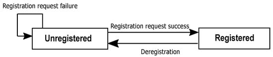 - CBSD Registration Procedure: A CBSD in the Unregistered state can send the registration request to the SAS after the mutual authentication procedure is completed successfully. The registration request message contains the identity, location, equipment capabilities, and measurement reporting capabilities of the CBSD. The SAS can either accept or reject the registration request. The CBSD transits to the Registered state once the SAS accepts the registration request. However, the CBSD remains in the Unregistered state if the SAS rejects the registration request. Figure 3 presents the registration state diagram of the CBSD.