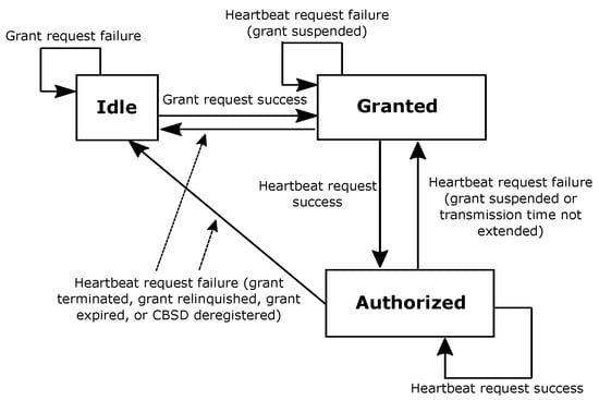 - CBSD Grant Procedure: A CBSD can start the grant procedure once it has successfully completed the registration procedure. Here, a grant can be seen as a contract between the SAS and CBSD through which the SAS authorizes a CBSD to transmit on the band only using the operational parameters specified in the grant. A CBSD in the Idle state can send a grant request to the SAS, which contains the operational parameters it plans to use for transmission. The SAS can accept the grant request if the operational parameters mentioned in the grant do not create any interference and reject the request otherwise. The CBSD transits to the Granted state if the SAS accepts the request and sends the grant expiry time and heartbeat interval time. The CBSD remains in the Idle state if the grant request is rejected. The CBSD in the Granted state cannot transmit on the band until it successfully completes the heartbeat procedure and moves to the Authorized state. Figure 4 presents the grant state diagram of the CBSD.