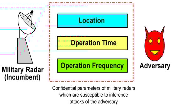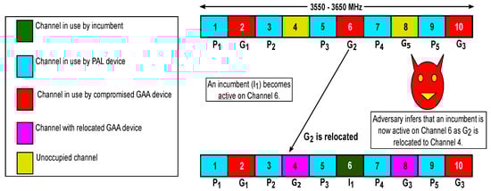 - Ben Mosbah, A.; Hall, T.A.; Souryal, M.; Afifi, H. Analysis of the Vulnerability of the Incumbent Frequency to Inference Attacks in Spectrum Sharing. In Proceedings of the 2017 14th IEEE Annual Consumer Communications & Networking Conference (CCNC), Las Vegas, NV, USA, 8–11 January 2017; IEEE: Piscataway, NJ, USA, 2017; pp. 640–642. [Google Scholar]