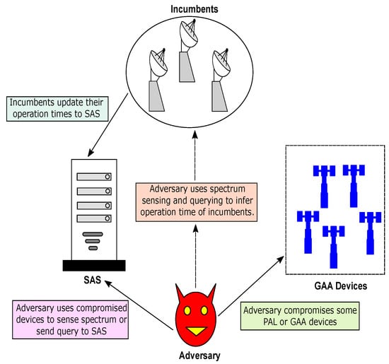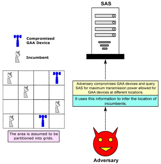 The CBRS architecture provides an additional 150 MHz spectrum and provisions access to the spectrum in both a licensed and unlicensed manner. It can be pivotal in realizing multiple use cases of evolving wireless communications. For instance, the mobile network operators can purchase the license and use the spectrum to offload their traffic, improving the quality of service for end-users. The GAA tier can be used for private LTE networks, industrial internet-of-things, smart homes, and other use cases [8]. The FCC has specified stringent regulations for protecting incumbents and PAL devices from harmful interference and allocating resources to the PAL and GAA devices [7]. Although the standards do not mandate any interference protection criteria for GAA devices, some coexistence mechanisms between GAA devices are required to ensure the quality of service to the end-user. Therefore, a relevant requirement is that different schemes for spectrum sharing and resource allocation adhere to the FCC regulations and lead to efficient utilization of the CBRS spectrum. The opportunity to unleash the potential of the CBRS spectrum for boosting the capacity of wireless networks is undoubtedly a welcome step in the current scenario of the global spectrum crunch. However, the risk of penetration of commercial devices into the private and confidential operational details of incumbents cannot be overlooked. The incumbents in CBRS include military radars, and hence, the privacy of their operation parameters is a matter of grave concern. As per the standard, incumbents’ location, operation time, and operation frequency are confidential, and any loophole in their privacy can have catastrophic effects on national security [9]. An adversary can infer the location of an incumbent by querying the SAS from multiple locations via a compromised device and analyzing the maximum transmission power permitted for the device [10]. Similarly, the operation time and frequency of incumbents can be inferred by an adversary if a compromised device is asked to vacate the spectrum [11,12]. Therefore, the mechanisms to preserve the privacy of incumbents in CBRS while maintaining the utility of PAL and GAA devices are required.