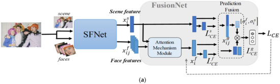 As shown in Equation (17), the overall loss function is the summation of the loss functions defined above, which evaluates the influence of the scene, faces, and the final fused features.