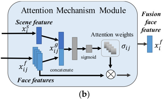 In FusionNet, we employed an attention mechanism to focus on important facial features. In the attention mechanism module, as shown in Figure 2b, we concatenated the scene feature with each face feature separately, fed the concatenated feature into a fully connected layer, and used the Sigmoid function to learn the attention weight. The process of learning attention weights can be formulated by Equation (3),