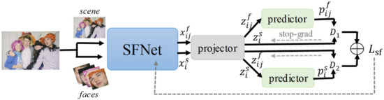 In order to pretrain the SFNet, we constructed a three-layer MLP named projector to map and , which are the scene feature and face feature extracted by SFNet, by Equations (7) and (8),